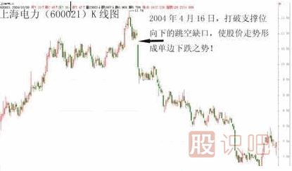 再如,上海電力(600021)這只個(gè)股在2003年10月29日上市后,一路震蕩上揚(yáng),走勢(shì)極為穩(wěn)健,但在2004年4月16日這天,突然間大幅跳空低開,留下了一個(gè)向下的突破缺口,使前期連續(xù)五個(gè)交易日的7.80元附近的支撐位立刻變成阻力位,而在7.80元附近買進(jìn)的投資者根本來不及反應(yīng),便已被深套。此后,該股股價(jià)一路單邊下跌,一直到跌破上市當(dāng)天的最低價(jià)。(見下圖)