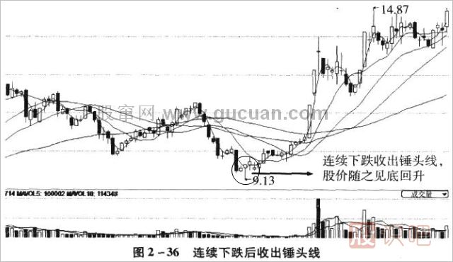 1.錘頭線形似“錘子”,無上影線,有下影線,在下跌過程中出現(xiàn),一般是見底的信號。