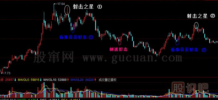 5.理想狀態(tài)是射擊之星(流星線)次日是向下跳空的長長的陰線與射擊之星的實體有缺口,缺口越大越有利。