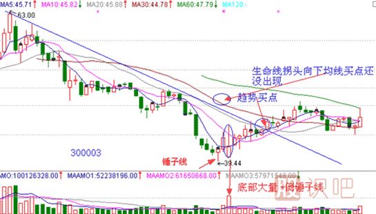 300003,樂普醫(yī)療,2010年1月28日出現(xiàn)了金針探底的特殊形式錘子線,隨后第三天2月1日就是我們傳說中的倒錘子線,而且伴有底部大量出現(xiàn),金針探底+倒錘子線組合是我研究中的必漲組合,由于底部大量的出現(xiàn),當(dāng)日實盤講解時就斷定此底部形態(tài)成立,后期越過阻擋線出現(xiàn)了趨勢買點,但生命線拐頭現(xiàn)在仍然向下,決策線壓制股價明顯,穩(wěn)健投資者仍然需要耐心等待。