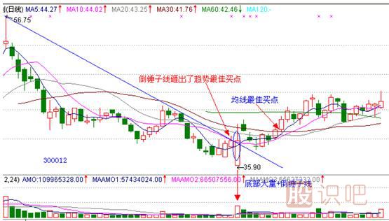 300012,華測檢測,日線圖,2010年2月1日出現(xiàn)了倒錘子線底部形態(tài),而且伴隨有底部巨額成交量,更讓人振奮的是此倒錘子線一舉突破阻擋線砸出了趨勢最佳買點,隨后幾天又出現(xiàn)了均線最佳買點,股票緩步盤升。