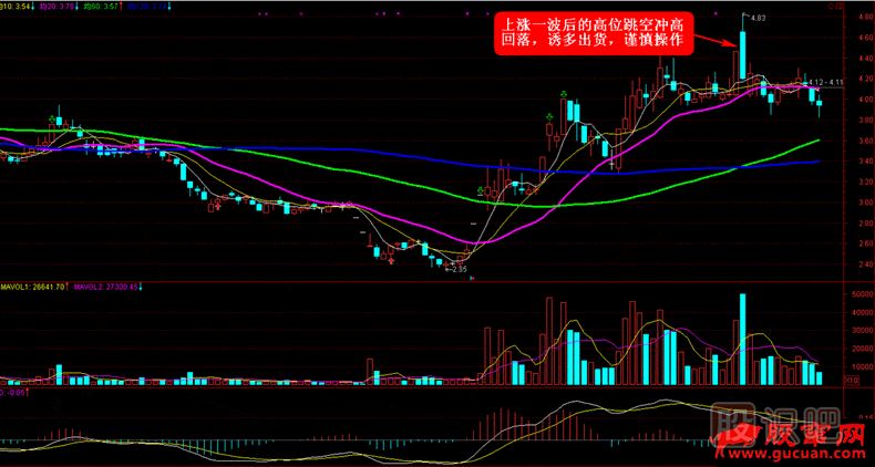 ③在強勢拉升一波后的高位的跳空突破缺口也要慎重操作,以防止莊家誘多高開沖高向下瘋狂拋售
