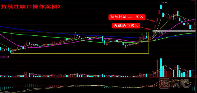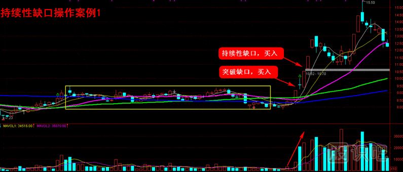 就持續(xù)性缺口的操作而言,投資者可以在出現(xiàn)持續(xù)性缺口后做出買入或者賣出決策,當方向向上時買入,此時同樣需要成交量的放大來對價格進行驗證(漲停板模式除外);反之,方向向下時賣出。