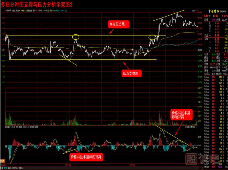 在實(shí)戰操盤(pán)中,每天剛剛開(kāi)盤(pán)時(shí),因為當天分時(shí)走勢的時(shí)間不長(cháng),整個(gè)分時(shí)趨勢沒(méi)有連續性,無(wú)法對短時(shí)的趨勢進(jìn)行有效的判斷,所以需要調出多日的分時(shí)圖,這樣可以清晰的看到多日分時(shí)圖上的支撐位與壓力位,對大盤(pán)及個(gè)股的買(mǎi)賣(mài)點(diǎn)做到更為精準的打擊。調出多日分時(shí)圖時(shí)可以通過(guò)點(diǎn)擊右鍵選擇多日分時(shí)圖或點(diǎn)擊分時(shí)走勢圖右下角的“+”、“一”號來(lái)實(shí)現。另外,這樣也可以把多日技術(shù)指標連接起來(lái),可以借助指標與價(jià)格的頂底背離來(lái)更為精確的研判買(mǎi)賣(mài)點(diǎn)。