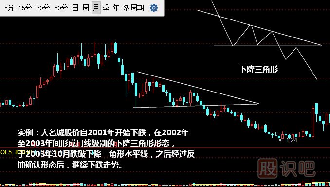 下降三角形形態(tài)K線(xiàn)圖圖解實(shí)例:大名城股價(jià)自2001年開(kāi)始下跌,在2002年至2003...