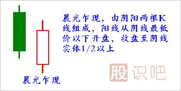 1.晨光乍現(xiàn)K線組合由兩根K線組成,一陰一陽,陽線低開高走,深入陰線實(shí)體的1/2以上。