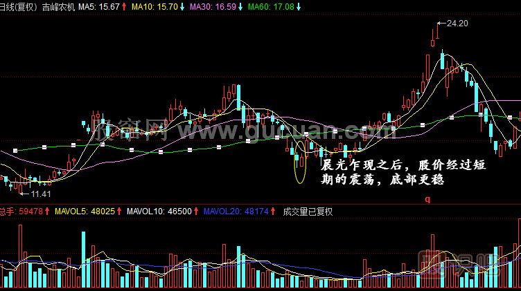 4.晨光乍現(xiàn)K線組合只用于在底部區(qū)域研判股價(jià),在高位謹(jǐn)防是回光返照。