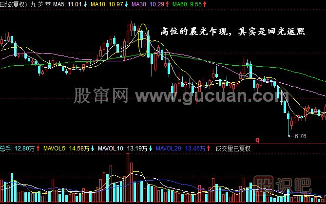 實(shí)例3:九芝堂(000989)于2010年4月22日沖高見頂,之后股價(jià)出現(xiàn)了一組空方炮的走勢,4月28日,該股低開高走,收出了一組晨光乍現(xiàn)。這個(gè)時(shí)候投資者應(yīng)當(dāng)買入嗎?