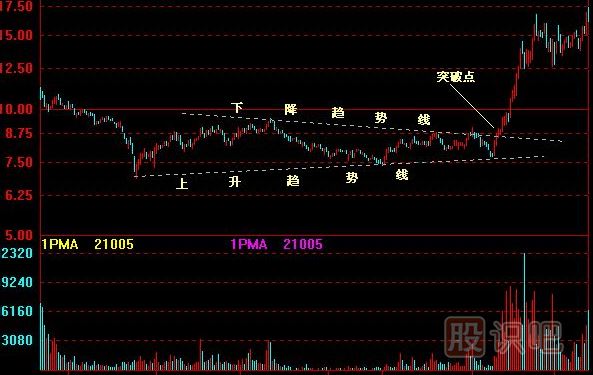 對稱三角形由一系列的價格變動所組成,其變動幅度逐漸縮小,亦就是說每次變動的最高價,低于前次的水準,而最低價比前次水準為高,呈一壓縮圖形,如從橫的方向看股價變動領(lǐng)域,其上限為向下斜線,下限為向上傾線,把短期高點和低點,分別以直線連接起來,就可以形成一相當對稱的三角形。對稱三角形成交量,因愈來愈小幅度的股價變動而遞減,然后當股價突然跳出三角形時,成交量隨之變大。