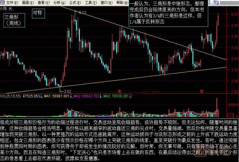 (4)雖然對稱三角形大部分是屬于整理型態(tài),不過亦有可能在升市的頂部或跌市的底部中出現(xiàn)。根據(jù)統(tǒng)計,對稱三角形中大約四分之三屬整理型態(tài),而余下的四分之一則屬轉(zhuǎn)勢型態(tài)。