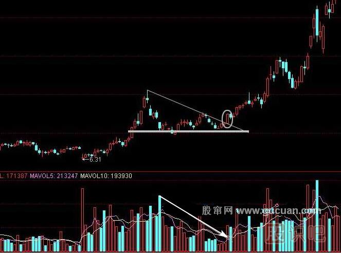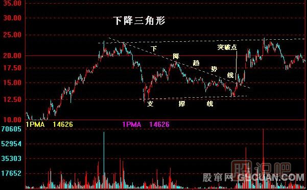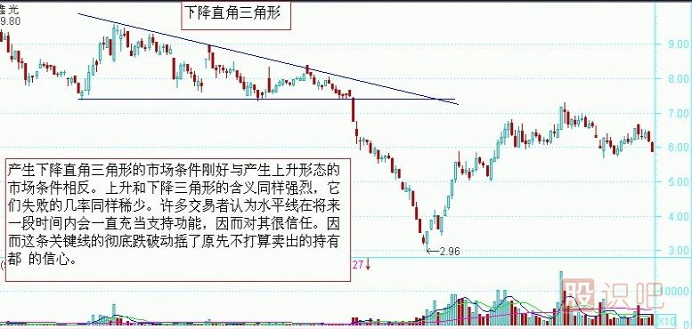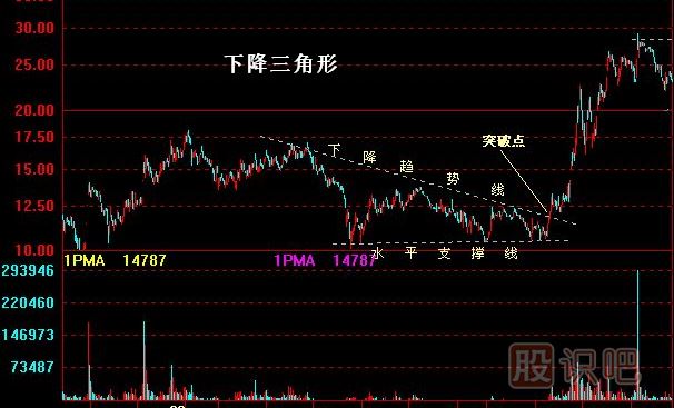 下降三角形的形狀的上升三角形恰好相反,股價在某特定的水平出現(xiàn)穩(wěn)定的購買力,因此介每回落至該水平便告回升,形成一條水平的需求線。可是市場的沽售力量卻不斷加強,股價每一次波動的高點都較前次為低,于是形成一條下傾斜的供給線。成交量在完成整個型態(tài)的過程中,一直是十分低沉。