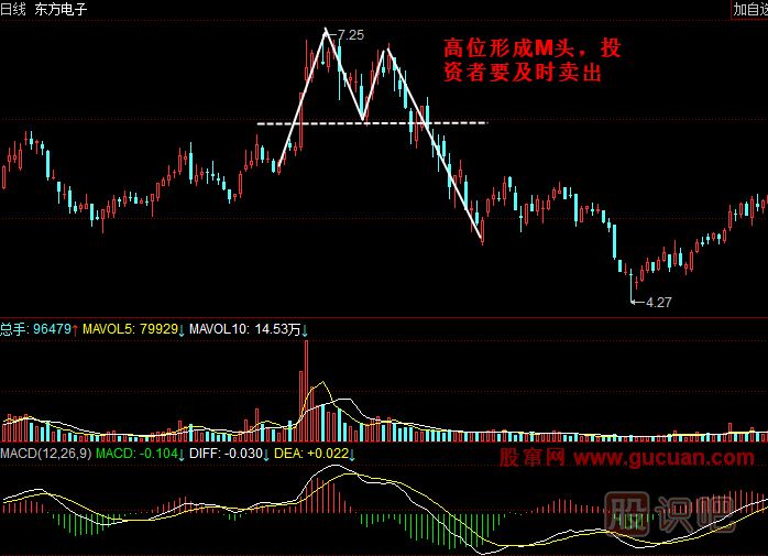 案例2:如圖所示,在前幾日連續(xù)漲停之后,東方電子(000682)2010年4月2日跳空高開高走,之后的幾天股價繼續(xù)強勢沖高,然后開始下跌,接下來股價再次走強又再次下跌,在高位形成了“M”形走勢。此時投資者不宜過早介入,短線獲利的投資者也應當落袋為安。