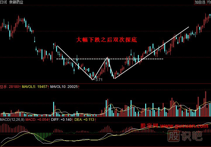案例1:如圖所示,2008年10月13日,京新藥業(yè)(002020)在經過較長一段時間的大跌之后于3.71元見底,在經過短期反彈之后再次探底。股價跌到3.71元附近時止跌,然后重新走強。兩次探明底部后股價繼續(xù)上漲,走勢上形成了W底的走勢,伴隨著成交量的放大——顯示出有大量資金入場抄底——此時投資者便可以順勢買入。