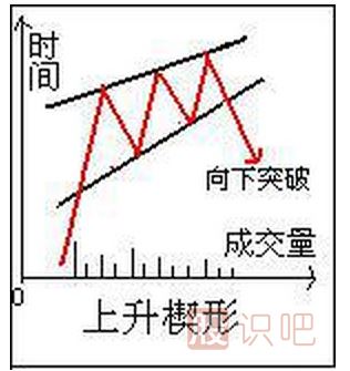 3. 上升楔形股價在形態(tài)內(nèi)移動,最后終會選擇突破方向,如果向下突破,其理想的跌破點是由第一個低點開始,直到上升楔形尖端之間距離的2/3?;蛘?股價一直整理到楔形的尖端,還稍作上升,然后才大幅下跌.這時主要看量能的變化,向上升破需要有大量配合,否則就可能是騙線.
