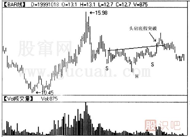 但是我們不能排除這樣一種情況:頭肩底形態(tài)形成時(shí),股價(jià)突破頸線,但不久股價(jià)突然又返回到頸線的另一邊,此時(shí)股價(jià)對(duì)頸線的突破信號(hào)是無效的,突破也就是成了“假突破”,投資者就很容易陷入頭肩底陷阱。如圖