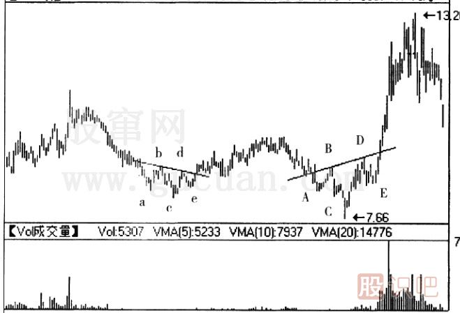 圖中的兩個(gè)頭肩底反轉(zhuǎn)形態(tài)出現(xiàn)在某只股票的走勢(shì)圖上,從圖中我們可以看到:前一個(gè)頭肩底中當(dāng)頸線b—d被突破之后,價(jià)格的反撲始終未擊破b—d的支撐,隨后維持了一段漲勢(shì)。在后面一個(gè)頭肩底中,其頸線B—D是向上傾斜的,這與頭肩底的頸線向下傾斜的慣例有些不相符。但恰恰是這種向上傾斜的頸線,預(yù)示著隨后展開的上漲行情會(huì)有較大的力度。從圖中可以看到,B—D被突破后,上升趨勢(shì)是何等強(qiáng)勁。