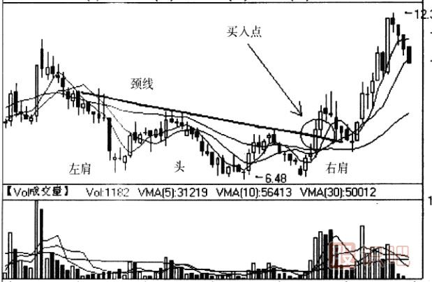 頭肩底形態(tài)的頸線被突破之后,股價(jià)通常會(huì)出現(xiàn)回抽,但回抽時(shí)成交量會(huì)相應(yīng)萎縮。在經(jīng)線的支撐下,股價(jià)不久就會(huì)重新回到上升趨勢(shì)中。