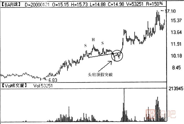 頭肩頂形態(tài)的最終完成是依靠對頸線(xiàn)的有效突破來(lái)確認的,一旦頸線(xiàn)被突破;那么價(jià)格一般不會(huì )再回到頸線(xiàn)被突破前的一邊。市場(chǎng)在突破頸線(xiàn)后,如果某一天的收盤(pán)價(jià)突然又返回到頸線(xiàn)的另一邊,這說(shuō)明頭肩頂形態(tài)的突破信號是無(wú)效的,突破也就成了“假突破”(如圖)。從整個(gè)價(jià)格形態(tài)的角度看,這就是失敗的頭肩頂形態(tài),其頂部反轉的意義就歸于無(wú)效。