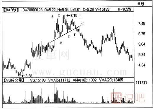 上圖頭肩頂形態(tài)出現在某只股票的日線(xiàn)圖上,該股價(jià)格在頭肩頂形態(tài)之前的一段時(shí)間里帶量上行,價(jià)格推動(dòng)出現第一個(gè)明顯的波峰A;隨后,在成交量的逐步萎縮之下,價(jià)格回落到B點(diǎn);在較高的成交量配合下,價(jià)格創(chuàng )出8.15元的新高,形成了頭部;從8.15元開(kāi)始,股價(jià)回落到D點(diǎn)(注意此時(shí)成交量也隨之萎縮)。市場(chǎng)從D點(diǎn)開(kāi)始上行至E點(diǎn),無(wú)力沖擊8.15元的頭部高位,形成右肩。在該頭肩頂形成過(guò)程中,成交量配合也相當完美。最后,股價(jià)也向上回抽,考驗頸線(xiàn)的有效性,但價(jià)格在G點(diǎn)處打住,并沒(méi)有回到頸線(xiàn)B-D之上,股價(jià)隨之輾轉而下。