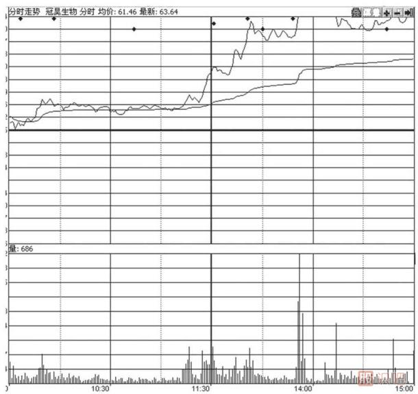 在股價(jià)已有一定漲幅后,瞬間以幾筆大單將股價(jià)筆直拉升至漲停(如圖3-11)。此為弱主力的投機(jī)性拉升,減輕拋壓,同時(shí)也可以減少跟風(fēng)盤,以利后續(xù)拉升。
