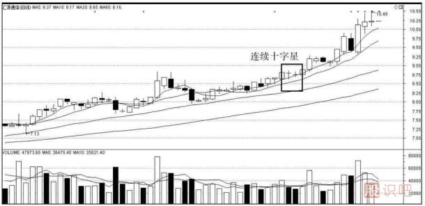一般來說,在市場環(huán)境趨暖的環(huán)境中,連續(xù)十字星會支撐股指的上漲,但在市場環(huán)境惡劣的情況下,連續(xù)十字星會對股指的上漲形成阻力。