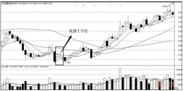 底部十字星的技術(shù)含義是:股價經(jīng)過大幅回落后,做空能量已大量釋放,股價無力再創(chuàng)新低,呈現(xiàn)底部回升態(tài)勢,這是較明顯的大市轉(zhuǎn)向信號。投資者見此信號,再結(jié)合其他技術(shù)指標(biāo),可考慮適量買進。