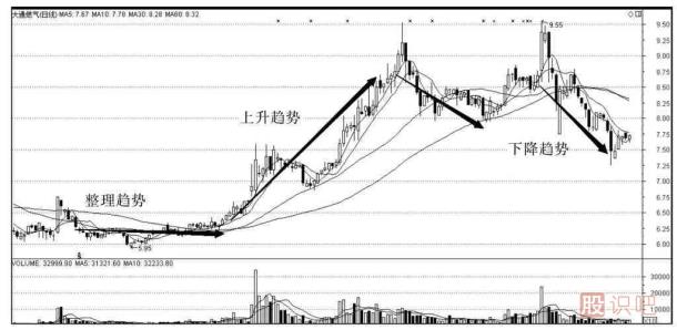 在股價(jià)波動(dòng)過(guò)程中,存在著三種基本趨勢(shì):上升趨勢(shì)、下降趨勢(shì)、整理趨勢(shì),如圖9-1所示。