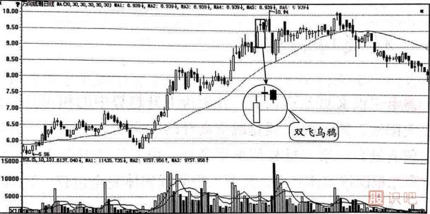 雙飛烏鴉是一種較為典型的股市轉向信號,在股價連續(xù)大漲之后出現(xiàn),兩根陰線在相對高位高開低走,暗示股價上升力度逐漸衰減,高位滯漲,后繼乏力。尤其是高位兩根高開低走的陰線組合呈空頭吞沒,空頭力量陡然劇增,投資者應當控制風險,及時獲利了結。