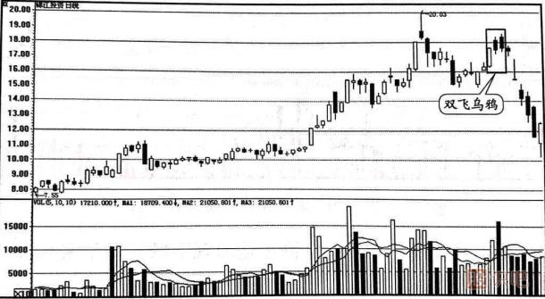 (3)雙飛烏鴉的最佳賣出點是在股價跌破第一根陽線的開盤價的位置。