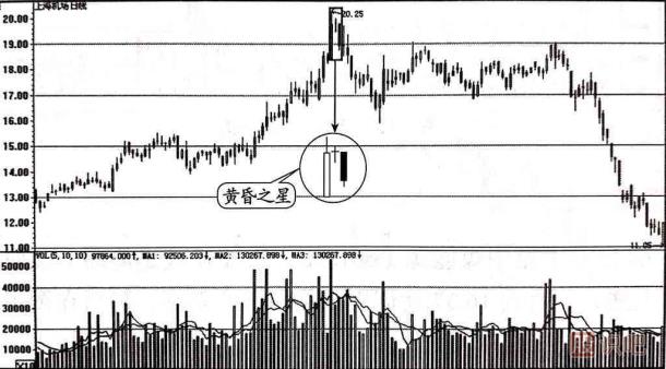黃昏之星是一種非常典型的股價見頂信號,如果它出現(xiàn)在股價運行上升趨勢的末期,或者出現(xiàn)在股價暴漲的極大漲幅處,則表明股價已經(jīng)見頂或是離頂部不遠,主力即將出貨,投資者應(yīng)及時清空出局。