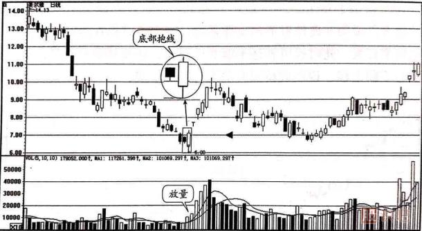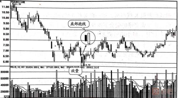 如圖1-2所示的是華夏銀行(600015)的日k線走勢(shì)圖。 該股從前期的高點(diǎn)11.34元開始下跌,在圖中所示的方框內(nèi)第一根K線處收出一根幾乎光頭光腳的中陰線,第二天收出一根幾乎是光頭光腳的大陽(yáng)線,將第一天的中陰線完全吞沒,從而形成了抱線的K線組合。 仔細(xì)分析這兩根K線,可以發(fā)現(xiàn),首先,這個(gè)抱線出現(xiàn)在股價(jià)的大幅下跌50%之后,然后,中陰線和大陽(yáng)線的實(shí)體的長(zhǎng)度相差雖然不是非常懸殊,但是第二根大陽(yáng)線處的成交量已經(jīng)開始放大。 綜合分析可以得出多方主力已經(jīng)開始發(fā)動(dòng)行情的結(jié)論,所以,投資者應(yīng)及時(shí)買入股票,后面會(huì)有一輪上升行情。