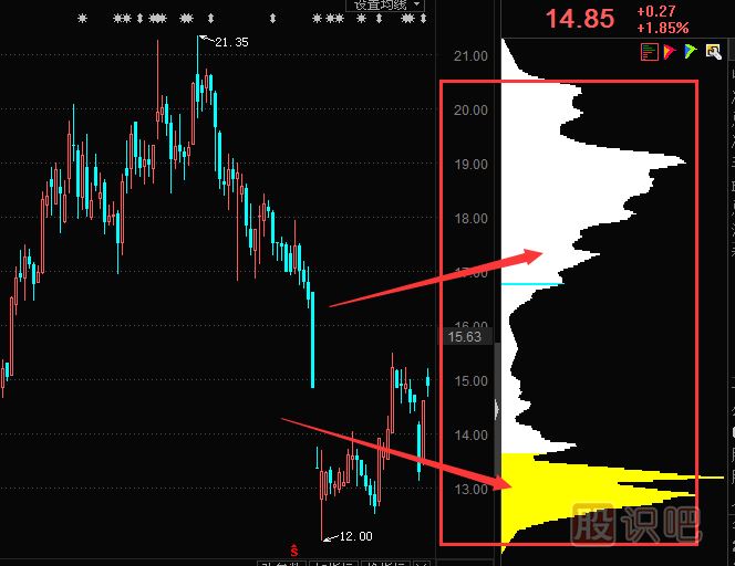 股價上漲空間較大的時候,股價大幅上漲與MACD指標的相對回落形成頂背離形態(tài)。頂背離形態(tài)出現(xiàn)以后,意味著指數(shù)繼續(xù)回升空間已經(jīng)不大了。與背離同步出現(xiàn)的是籌碼主峰為投資者的持股成本已經(jīng)大部分轉移到了價格高位。背離選題提示我們股價很難脫離籌碼主峰上漲,那么股價下跌期間,跌破籌碼主