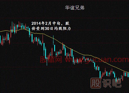 如圖,2014年2月中旬,華誼兄弟(300027)的股價(jià)短暫突破30日均線(xiàn)后馬上遇到阻力回調。這個(gè)形態(tài)證明30日均線(xiàn)是股價(jià)下跌行情中的重要阻力線(xiàn)。這之后幾個(gè)月內,股價(jià)多次反彈至30日均線(xiàn)位置后都遇到阻力下跌。