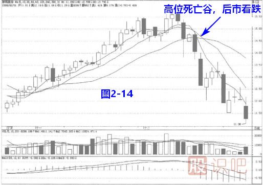 見(jiàn)圖2一14,股價(jià)經(jīng)過(guò)前段上漲,處在高位,已開(kāi)始出現(xiàn)多根大陰線,股價(jià)短期無(wú)法繼續(xù)上揚(yáng),后來(lái)出現(xiàn)高位死亡谷,更表明此處空方力量的強(qiáng)大,投資者應(yīng)先行出局觀望。該股后市一瀉千里,短期跌幅巨大。