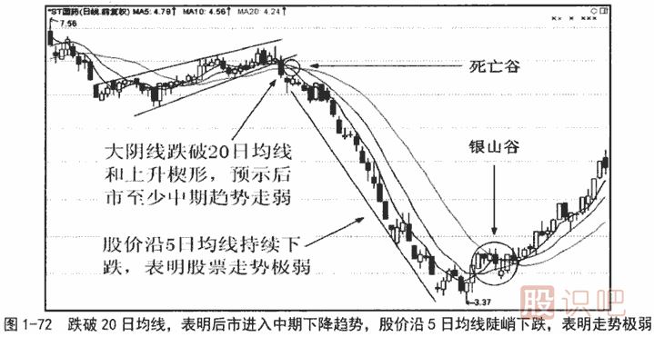 圖1-82是ST廣夏(000557)的日線圖。股價(jià)第一次向上突破20日均線時(shí)嗎,20日均線雖然已由下行變?yōu)樽咂?,但股價(jià)和20日均線均位于60日均線下方,尚不能確認(rèn)趨勢(shì)轉(zhuǎn)暖,至多是博反彈的買入點(diǎn)。
