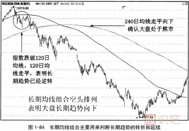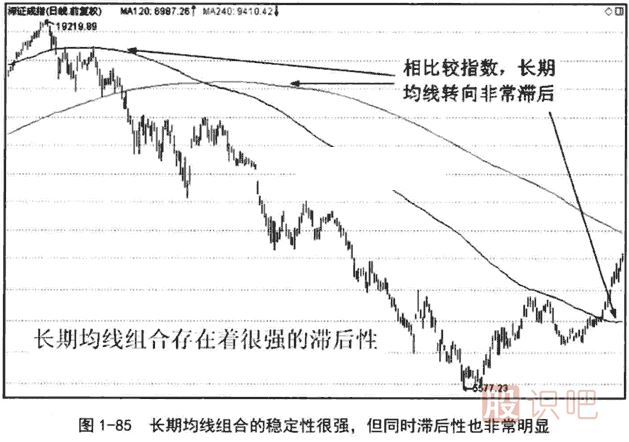 圖1-85是與圖1-84同一時(shí)間段的日線圖,從圖上觀察,當(dāng)120日均線和240日均線在頂部轉(zhuǎn)向時(shí),指數(shù)已經(jīng)下跌較大一段了。尤其是240日均線轉(zhuǎn)向時(shí),指數(shù)已下跌到那一輪熊市跌幅的一半,滯后性非常明顯。