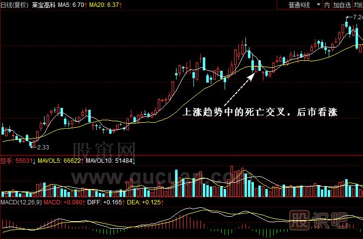 2.上漲趨勢(shì)中均線死亡交叉,后市看漲,擇機(jī)入場(chǎng)。