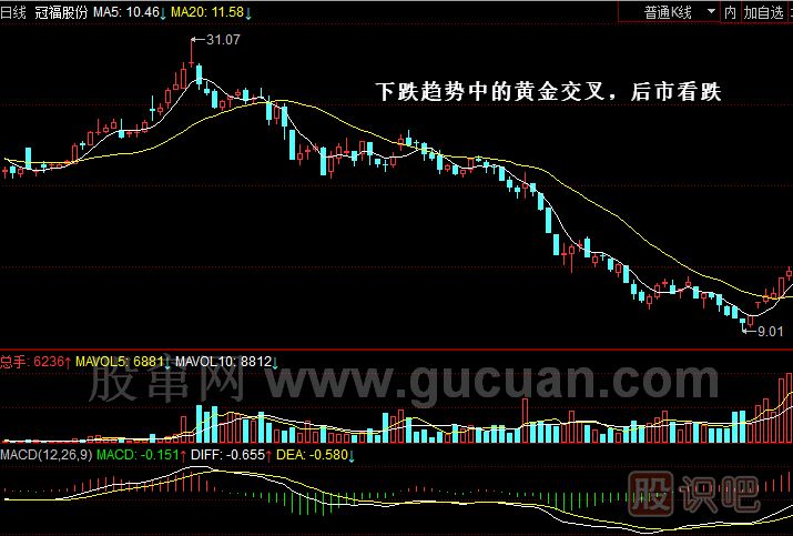 如圖所示,股價處在下跌趨勢中,當均線黃金交叉時,說明股價在此處于一個小反彈的過程中。下跌趨勢中的每一個反彈都是很好的出局點。