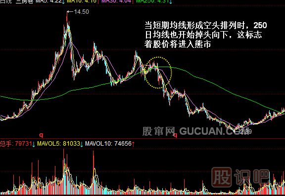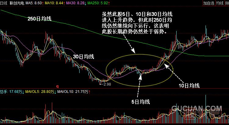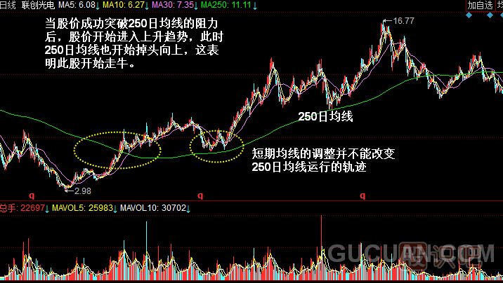 由于250日均線并不是用來分析這一年的走勢的,而是用來分析幾年來市場總體趨勢的,因此對指數(shù)漲跌的反應非常緩慢,輕易不會出現(xiàn)拐頭。此均線一旦出現(xiàn)拐頭,對大盤的中長期走勢會產(chǎn)生深遠影響,不過250日均線對于市場中短期走勢影響較小。250日均線形成一定的角度向上或向下運行時,指數(shù)隨后會出現(xiàn)長期牛市或長期熊市,但年線向下運行或處于走平狀態(tài)時,短期內(nèi)股指或股價還會沿原趨勢波動,也就是說股指或股價既可能上漲,也可能下跌或是繼續(xù)橫向整理。