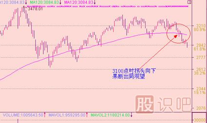 這個(gè)圖是最近A股上證走勢圖,3100點(diǎn)時(shí)拐頭開(kāi)始向下,此時(shí)投資者必須果斷出局,這是基于趨勢線(xiàn)的指導作用所做的決定。從此處看大盤(pán)后市還有下挫空間,投資者不可盲目抄底。那什么時(shí)候可以去跟進(jìn)抄底,我們下面將要詳細講述。