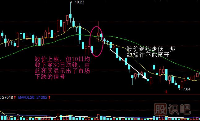 10日均線(xiàn)上傳30日均線(xiàn)形成金叉,顯示市場(chǎng)短線(xiàn)繼續強勢,是短線(xiàn)買(mǎi)入信號;10日均線(xiàn)下穿30日均線(xiàn)形成死叉,顯示市場(chǎng)短線(xiàn)持續疲弱,成為短線(xiàn)賣(mài)出信號。