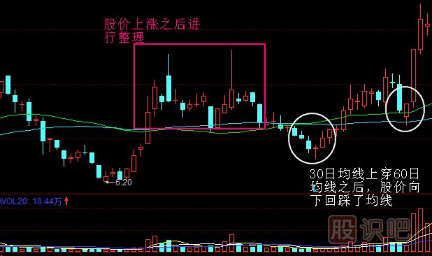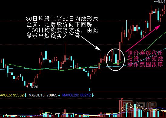 2、在股價(jià)一般性上漲,同時(shí)30日均線(xiàn)和60日均線(xiàn)形成金又時(shí),一般會(huì )回踩30日均線(xiàn),在股價(jià)回踩30日均線(xiàn)時(shí)即可買(mǎi)入。