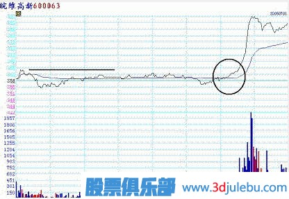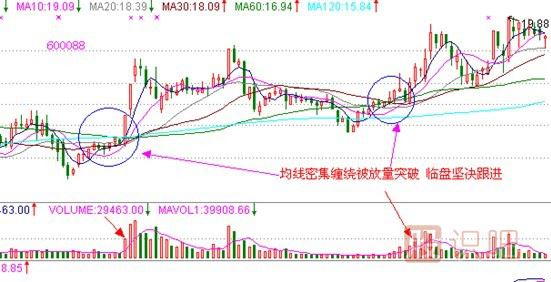 第二,股價(jià)需放量突破均線(xiàn)密集纏繞。這點(diǎn)是關(guān)鍵,均線(xiàn)走平意味著(zhù)多空勢均力敵,多為主力在此吸籌階段。放量突破意味主力拉升股價(jià)已經(jīng)啟動(dòng),打蛇打七寸,這個(gè)地方買(mǎi)進(jìn)是掐住了股價(jià)啟動(dòng)的時(shí)空關(guān)鍵點(diǎn)。