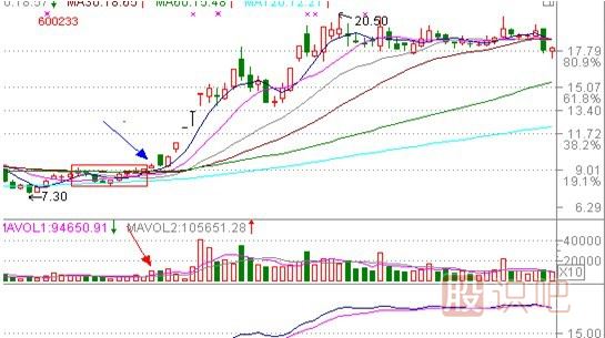 600088,中視傳媒,日線(xiàn)圖,2009年10月份、12月份兩次均線(xiàn)密集纏繞被放量長(cháng)陽(yáng)突破,股價(jià)短期都有30%以上的漲幅。從這里我們可以看出放量突破是必需條件,如果無(wú)量能參與很可能構成誘多,同時(shí)最好是長(cháng)陽(yáng)突破,長(cháng)陽(yáng)才能顯示主力做多的決心。