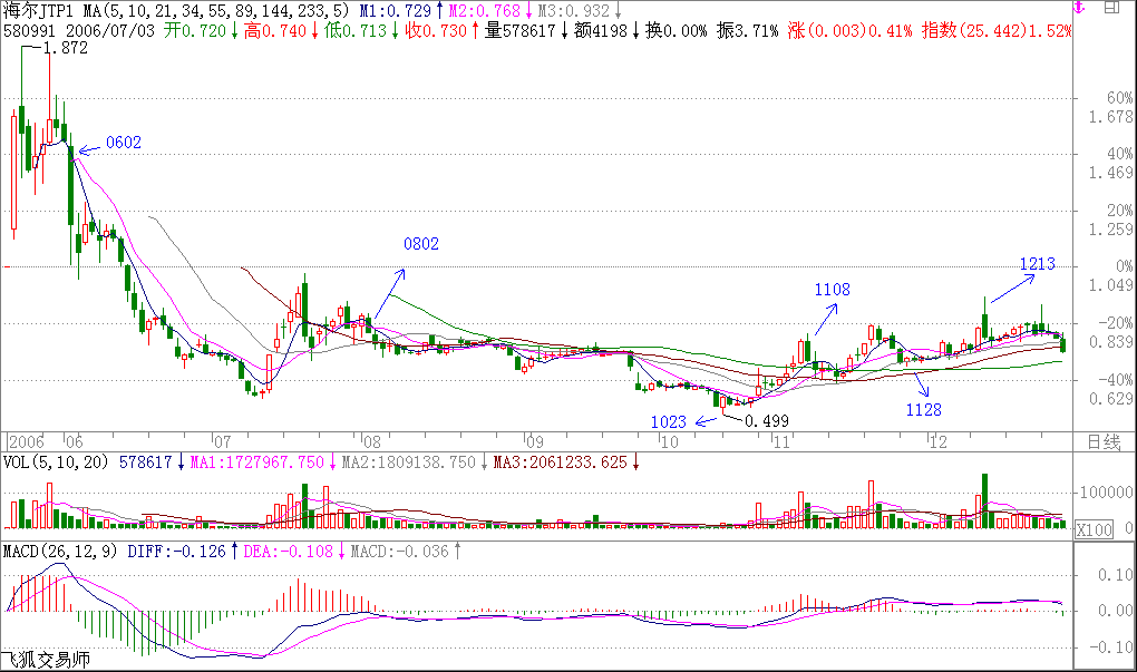 純粹的兩條均線(xiàn)的K線(xiàn)圖,就足以應付最復雜的市場(chǎng)走勢了。當然,如果沒(méi)有這樣的看圖能力,可以參照一下技術(shù)指標,例如MACD等,關(guān)于各技術(shù)指標的應用,以后會(huì )陸續說(shuō)到。