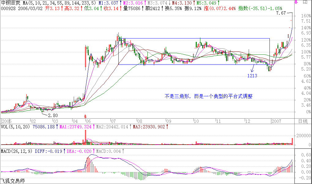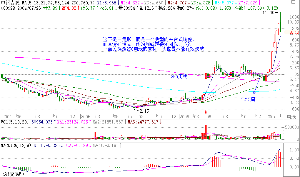 這不是三角形,而是一個(gè)典型的平臺式調整。而且恰好相反,他的周線(xiàn)走得還可以,不過(guò)下面關(guān)鍵是250周線(xiàn)的支持,該位置不能有效跌破。