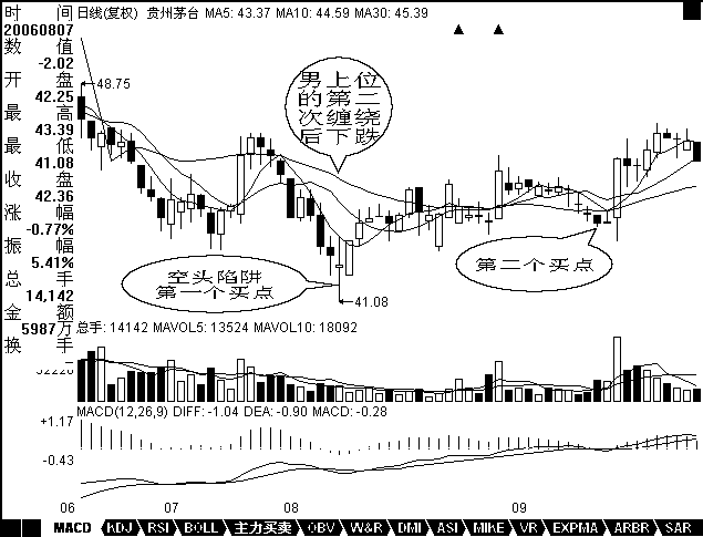 8月7日,男上位的第二次纏繞后下跌,但成交量等都明顯出現背弛,構成小的空頭陷阱,成為第一個(gè)買(mǎi)點(diǎn)在41元附近。