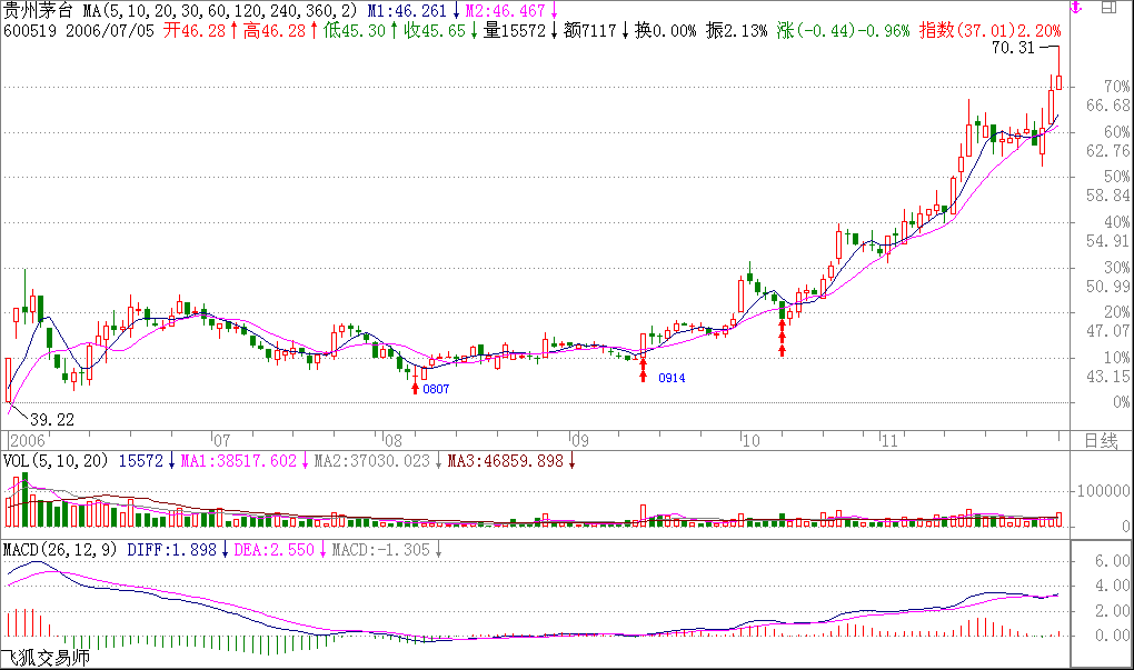對于喜歡用日線(xiàn)的,用茅臺為例子給一個(gè)分析,5日和10日。